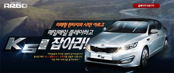 ... ‘아르고’측은 2~30대 유저에게 호응을 얻고 있다는 판단아래 젊은 층이 선호하는 중형 세단, 최신형 휴대폰, 컴퓨터 주변기기 등을 제공하는 고객 감사이벤트를 준비했다. 이벤트 기간 동안 아르고에 접속한 후 화면 오른쪽 하단에 위치한 이벤트 버튼을 클릭하면 추첨을 통해 ‘K5