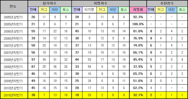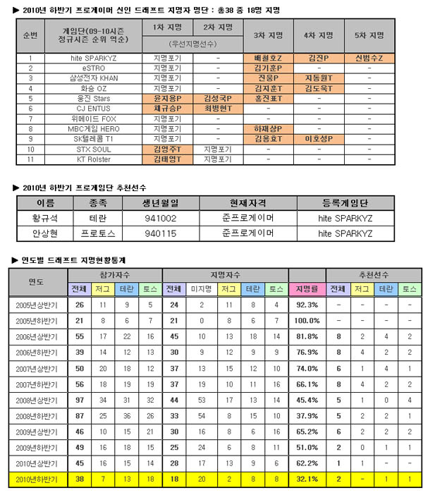 ...사단법인 한국e스포츠협회(회장 조기행)는 ‘2010년 하반기 스타크래프트 프로게이머 신인 드래프트’를 23일 13시 협회 지하 1층 대강당에서 개최했다. 이번 드래프트는 공군 팀을 제외한 11개 스타크래프트 프로게임단 코칭스텝이 참여해 참가 선수들의 이력을 살피고 드래프트 평가전