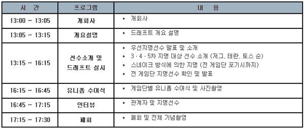 ...한국e스포츠협회는 2010년 하반기 스타크래프트 프로게이머 신인 드래프트를 오는 23일 서울 정동에 위치한 사랑의열매빌딩의 대강당에서개최한다고 밝혔다. 이번 드래프트는 우선 지명선수를 발표하고,정규시즌 순위 역순으로시작하는 스네이크 방식에 의한 지명을 통해 게임단 지명선수를 뽑