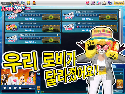 ... 이번 로비업데이트로 유저들은 로비에서 각자의 플레이 성향에 따라 ‘인기모드’, ‘유저가 많은 방’, ‘방 번호순’ 등의 기준으로 방을 정렬할 수 있어 빠른 입장이 가능해졌다. 또한, 새로운 로비시스템에서는 클릭 한 번으로 각 방 별 게임참여자 정보, 플레이중인 음악정보 및 남