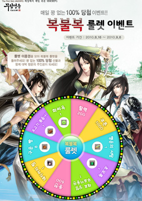 ...이벤트는 게임 접속 외에 자유게시판 게시물 등록, 댓글 작성, 황금 구매 등을 통한 룰렛이용권을 사용하여 참가할 수 있으며, 이벤트 페이지의 룰렛을 돌려 활력과 쿠폰 1000개, 행운의 사탕부터 동전 500개에 이르는 등 다양한 아이템들을 증정 받을 수 있다. 현재 넷마블 '무림영