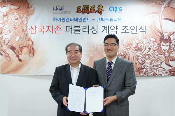 ...com, 대표 이학재)는 ㈜큐빅스튜디오(대표 최웅규)가 개발한 웹게임 ‘삼국지존(가칭)’의 퍼블리싱 계약을 체결하고 8월 10일(화) 하이원엔터테인먼트 태백 본사 사옥에서 조인식을 가졌다고 밝혔다. ‘삼국지존’은 친숙한 삼국지를 기반으로 개발된 영웅 전략 시뮬레이션 웹게임으로
