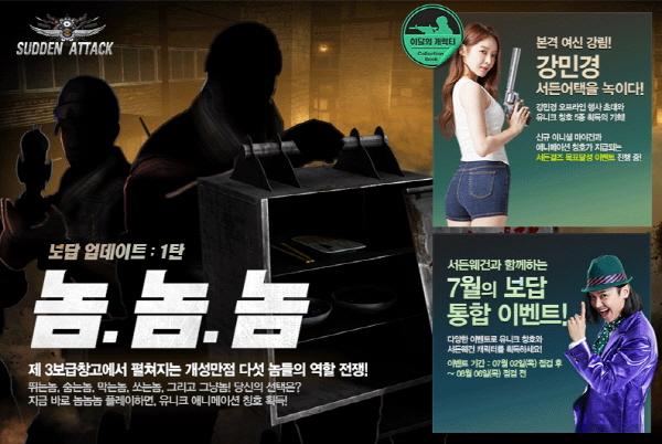 ... 모든 역할의 공적을 달성할 경우 특수 애니메이션 칭호가 지급되며, 8월 20일까지 신규 모드를 16회 이상 플레이하는 유저에게는 'RA-PDW(S)15일' 아이템이 주어진다. 넥슨은 공식 홈페이지를 통해 이번 업데이트 홍보모델 강균성이 신규 모드 '놈놈놈'의 5가지 역할과 게임방