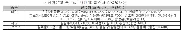... 09-10시즌 결승전에서 우승을 차지한 KT Rolster 이지훈 감독이 ‘도전팀’을 준우승을 차지한 SK 텔레콤 T1 박용운 감독이 ‘열정’팀을 지휘한다. 첫 올스타전 감독으로 나서는 이지훈 감독과 지난해 우승으로 올스타전 감독을 맡았던 박용운 감독은 8월 10일(화) 올스타
