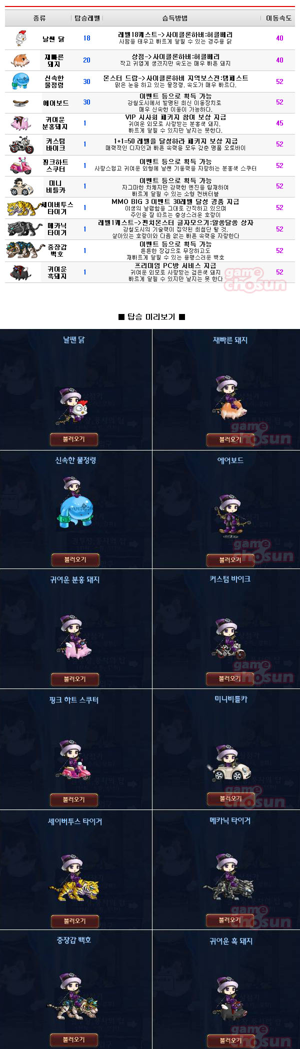 ... 현재까지 게임상에서 볼 수 있는 '탈 것'의 종류와 성능은 아래와 같다. 이외에도 꾸준한 업데이트로 지속적으로 다양한 즐길 거리와 함께 '탈것'도 업데이트 될 예정이다. 이번에 살펴본 다양한 탈 것은 펀치몬스터의 여러가지 시스템 중 일부분에 지나지 않는다