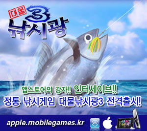 ...mobilegames. kr)에 출시하여, 출시당일 앱스토어 종합 다운로드 순위 1위에 등륵했다고 9일 밝혔다. 이번에 애플 앱 스토어에 출시된 '대물낚시광3'는 독도, 몰디브, 플로리다, 케이프타운, 뉴질랜드등 세계의 유명한 낚시 어장을 마음껏 누비며, 즐길 수 있도록 구성된