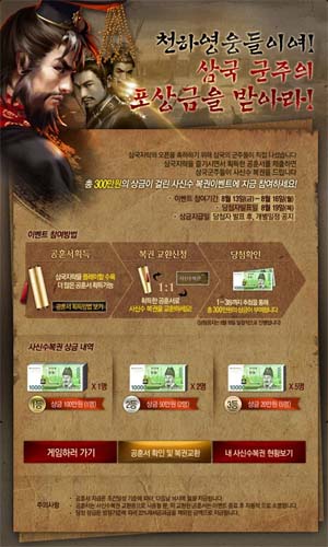 ... 이번 프리오픈 서비스는 13일부터 3일간 매일 8시간씩 진행되며 삼국지 본연의 재미와 감동이 살아있는 <삼국지략>의 게임성도 즐기고 푸짐한 경품 당첨의 기회도 얻을 수 있는 1석 2조의 이벤트 프로모션이 함께 마련됐다. ‘삼국 군주의 포상금을 받아라’는 주제의 이번