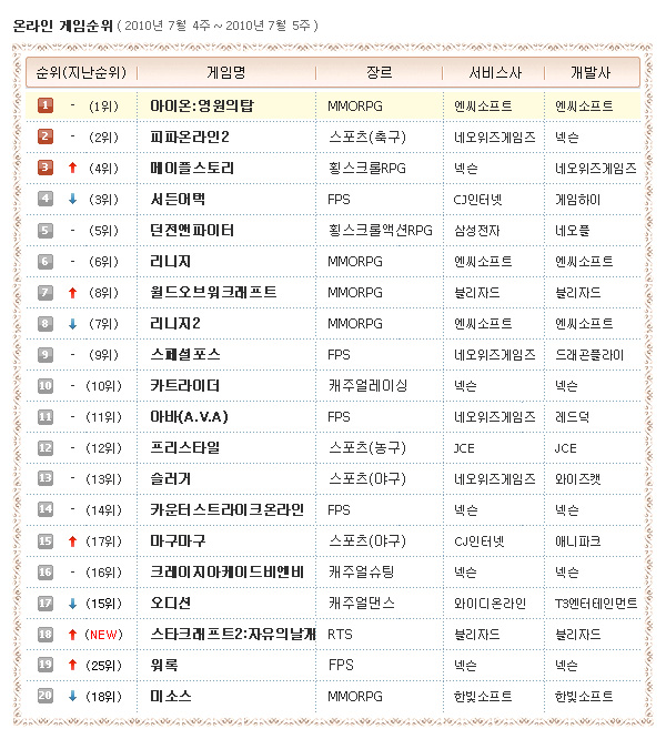 ... 이번 주는 전체적으로 안정적인 순위권을 유지한 가운데 최근 탄력을 받은 게임들의 등장이 순위변동을 일으킨 모습입니다. 총 5종의 게임의 순위 상승이 눈에 띄는데요. 가장 눈에 띄는 것은 올해 최대 기대작으로 부각돼온 ‘스타크래프트2: 자유의날개(이하 스타2)’의 순위권 진