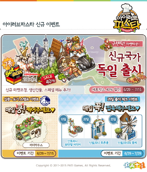 ... 또한 신규 국가 오픈을 기념해 독일 조경 아이템과 마켓머신 등 총 7종의 아이템이 세트박스로 구성돼 40% 할인된 가격으로 7월 15일까지 판매된다. 이와 함께 여름맞이 신규 패키지 상품 '산토리니 럭키박스'가 출시된다. 해당 상품을 통해 유저는 최대 산토리니 남/여 캐릭