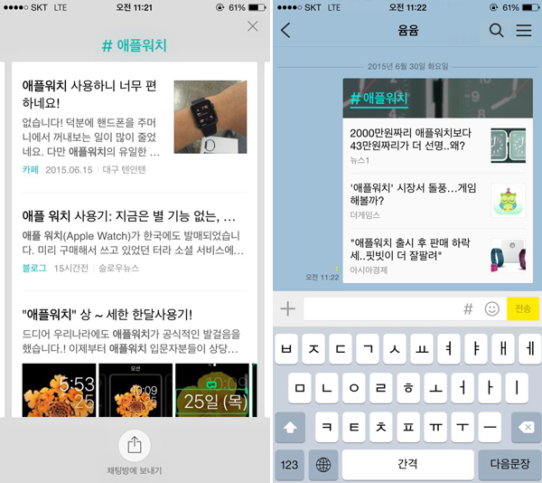 ... 이를 통해 다른 앱으로 이동하는 번거로움을 없애는 한편, 검색 결과 아래 위치한 '공유하기' 버튼을 통해 채팅방에 바로 검색 결과가 공유될 수 있도록 했다. 카카오톡 샵검색은 검색이 친구들과의 대화를 이어가거나 새로운 대화의 소재로 이용된다는 점을 고려해 공유하기에 최적화된 모습