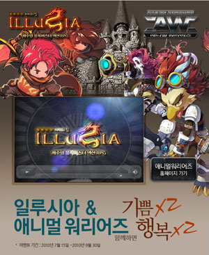 ... 먼저 '일루시아'를 통해서는 게임 내의 미션 모드와 게임 홈페이지를 통해 애니멀워리어즈-NPC지키기, 콤보 달성 등 '애니멀워리어즈'와 관련된 다양한 특별 미션이 주어진다. 이 미션에 성공하면 '일루시아'와 '애니멀워리어즈'의 아이템 선물이 제공된다. 이벤트는 9월 말까지 진