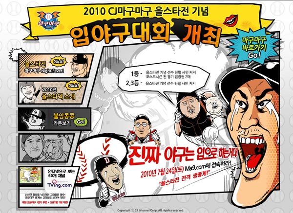... 대회 참가는 넷마블 회원이면 누구나 가능하며, 올스타전 당일 마구마구 홈페이지(ma9. netmarble. net)를 통해 참가할 수 있으며, 우승자는 최다 추천수를 기록한 베스트글 중 상위 10건을 대상으로 투표를 진행하여 선정된다