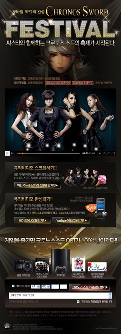 ... 유저들은 뮤직 비디오 영상을 보고 자신만의 크로노스 소드 공연을 UCC로 만들어 이벤트에 참여할 수 있다. 네이트와 유투브에 올린 참가자 중 추첨을 통해 아이팟(1명)과 벅스 음악상품권(30명)을 제공한다. 이 밖에 이벤트 페이지를 통해 게임을 다운로드 받으면 참가자 전원에