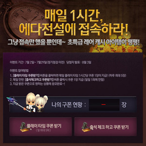 ...com)이 무더운 여름, 7월을 맞아 시원하게 더위를 사냥할 수 있도록 매일 1시간, 에다전설에 접속하라!라는 이벤트를 지난 2일부터 실시했다. 매일 1시간, 에다전설에 접속하라!는 레어 캐시 아이템이 제공되는 이벤트로 오는 29일까지 진행된다. 이벤트 참여 방법은 매일 플레이