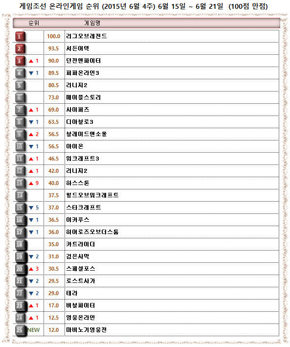 ... 중상위권에서는 '사이퍼즈' '블레이드앤소울'이 각각 1계단, 2계단씩 올라 7위, 9위를 달성했으며, '하스스톤'은 지난 주 신규 업데이트에 힘입어 눈에 띄는 상승세를 보였다. 반면 '스타크래프트'는 5계단 하락해 15위를 기록했으며, 지난 주 상승세를 보였던 '이카루스'