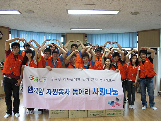 ... 먼저 엠게임 ‘사랑나눔’ 동아리는 자사와 업무제휴를 맺고 있는 (주)에듀박스(대표이사 박춘구, 이대호)가 기증한 영어학습교재를 가산종합사회복지관을 이용하고 있는 저소득계층 아동 280명에게 전달했다. 또한 복지관 내 도서관을 비롯한 놀이문화 시설의 청소 및 정비 작업에 참여했