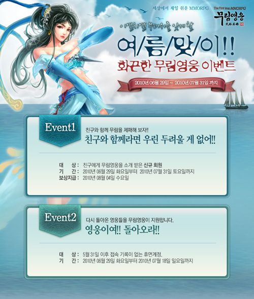 ... 먼저 친구와 함께하면 푸짐한 혜택이 제공되는 “친구와 함께라면 우린 두려울 게 없어!!”는 이벤트 기간 동안 신규 회원이 <무림영웅> 공식 홈페이지에 1:1 문의를 통해 ‘이벤트 참가’란 제목으로 친구를 추천하면 참여 가능하다. 또한 이벤트에 참여한 게이머들 중,