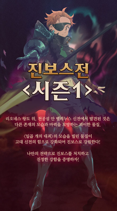 ... 또한, 일곱 개의 대죄 최초로헬 난이도가 진보스전을 통해 선보이게 될 예정. 단,14일에는 하드 난이도를 먼저 선보인 후 21일에 익스트림과 헬 난이도를 차례로 오픈할 예정이다. 시즌제로 진행되는 진보스전의 시즌1 보스는 '킹'