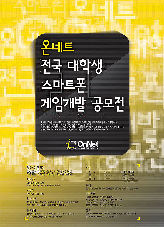... 공모전 응모는 2년제 이상의 국내외 대학생 및 대학원생이면 가능하며, 개인 또는 3명 이내의 팀으로 응모가 가능하다. 온네트 공모전 홈페이지를 통해 6월 30일까지 기획서를 제출하고, 10월 5일까지 작품 개발을 완료하면 된다. 온네트는 공모전에 응모된 아이디어 중 대상과 금