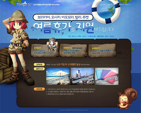 ... 첫 번째 이벤트는 신규 회원을 위한 ‘신규 가입하고 해외 여행 고고싱~’ 이벤트이다. 이벤트 기간 동안 신규로 가입한 회원 중 10레벨을 달성한 회원을 추첨해 보라카이 4박 5일, 일본 오사카 3박 4일, 새로텍 i-nee(320GB) 외장하드를 증정한다. 두 번째 이벤트는
