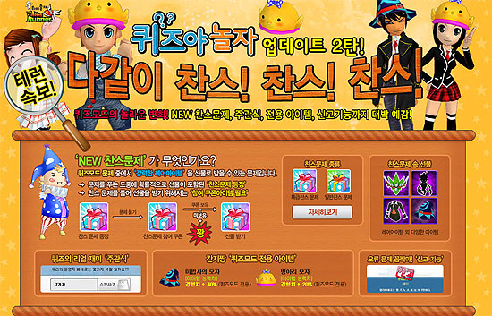 ... ‘퀴즈모드’ 2차 업데이트로 약 2천여개의 새로운 문제는 물론, 다양한 기능의 추가로 색다른 퀴즈 풀이의 재미를 즐길 수 있도록 하였다. 먼저 ‘NEW 찬스문제’를 도입. 찬스문제를 푼 유저에게는 강력한 레어아이템을 선물로 지급하는 기능을 추가하였다