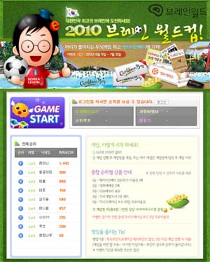 ...com)는 2010년 두뇌강국 코리아를 위한 대국민 두뇌개발 캠페인을 전개한다고 16일 밝혔다. 그 일환으로 남아공월드컵 시즌에 맞게 ‘브레인 월드컵’ 두뇌게임을 오픈하여 대한민국 최고의 브레인을 뽑는다. 브레인월드컵은 혼자 하는 게임이 아니라 다수가 참여하는 대전형식의 게임으