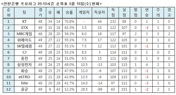 ... KT는 5라운드 들어 1승도 거두지 못하면서 상위권 팀들의 추격을 허용했다. 다행히도 4라운드에서 9승2패로 쾌조의 성적을 거둔 2위 STX SOUL이 5라운드 들어 동반 부진하면서 역전을 허용하지 않았지만 이영호의 부진으로 인해 마음을 졸였다. 특히 에이스 결정전에서 좋은