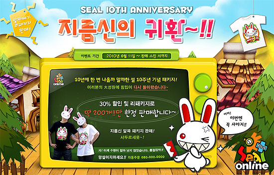 ...co. kr) 통해 선착순 판매한다고 전했다. ‘씰 온라인’은 지난 5월 ‘꾀돌이’ 캐릭터 상품 5종과 게임 아이템이 포함된 씰 10주년 기념 패키지를 300개 한정 수량으로 선보여 유저들 사이에서 큰 인기를 얻은 바 있으며 계속되는 유저 요청에 의해 기존 보다 30% 이상 저렴