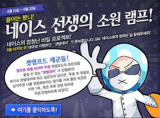 ... ‘겟앰프드 하드코어’의 대표 운영자(GM) ‘네이스’가 함께하는 이번 프로모션은 유저들이 원하는 것을 투표와 댓글을 통해 남기는 방식으로 진행되며, 접수된 유저들의 의견을 오는 6월 26일에 진행되는 ‘겟앰Day’에 반영할 예정이다. 유저는 프로모션 기간 동안 ‘목표 달성
