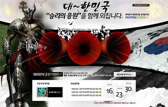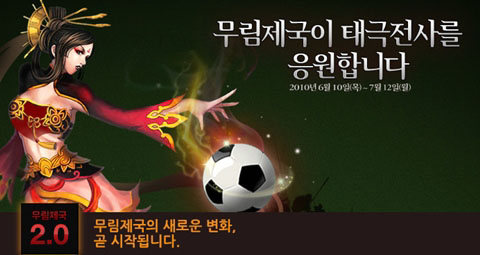 ... ‘무림제국이 태극전사를 응원합니다. ’는 태극전사의 승리를 기원하는 응원메시지를 댓글로 달아 참가하는 이벤트로, 댓글을 남긴 참가자 전원에게 ‘자원교환권’ 쿠폰을 지급한다. ‘16강 기원, 승리를 상상하라! Quiz’ 는 대한민국의 예선전 경기를 예상하여 댓글로 경기 결과를