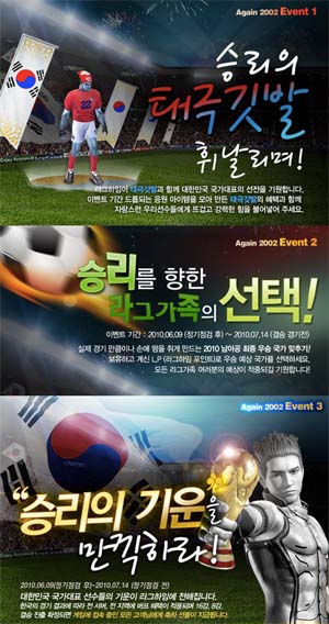 ... 위메이드의 대표무협 MMORPG <미르의 전설2>는 “국가대표팀 응원 프로젝트”, “대한민국의 첫 골을 응원합니다. ”를 진행하고, ‘첫 득점 선수를 맞춰라’, ‘경험치&드랍률up’, ‘응원 코스튬 추가’ 등 세가지 이벤트를 통해 이용자들을 찾아간다. 응모를
