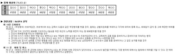 ... 이와 관련하여 6월 4일(금) 관련 사건의 1차 공판을 통해 피의자들이 대부분의 혐의사실을 인정함에 따라 상벌위원회를 개최하게 됐다. 상벌위원회는 오랜 논의 끝에 피의자들이 대한민국 e스포츠 업계에 대한 업무방해와 명예훼손을 심대하게 초래하였다고 판단하여 전원 중징계를 내리기로