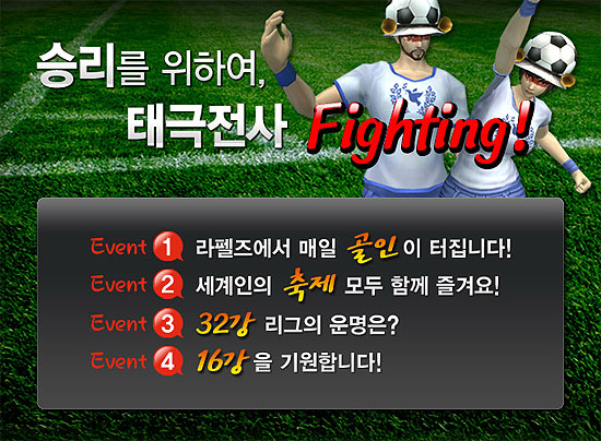 ... <라펠즈>의 이벤트는 게임내 NPC와의 미니게임을 통해 우승에 도전하는 ‘라펠즈에서 매일 골인이 터집니다!’, 실제 경기에서 승리한 국가에 따라 ‘이동속도 증가’, ‘회피 증가’ 등의 매일 다른 버프 혜택을 서버 전체 게이머에게 제공하는 ‘세계인의 축제 모두 함께 즐