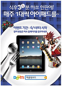 ... 이번 이벤트와 관련하여 게임사업본부 민영환 본부장은 “30분의 플레이만으로도 충분한 재미를 느낄 수 있는 하울링쏘드가 매일 늘어나는 신규가입자를 위해 준비한 이벤트”라며, “이번 기회에 쉽고 재미있는 하울링쏘드를 만나보고, 덤으로 아이패드도 받아가길 바란다”고 말했다. 지난
