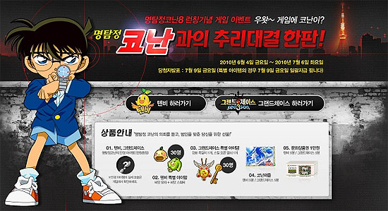 ... 투니랜드에서 서비스 중인 게임 '텐비(서비스:네오위즈게임즈/개발:시메트릭스페이스)와 ‘그랜드체이스' (서비스:CJ인터넷/개발:KOG)에 명탐정 코난의 미션(퀘스트)을 삽입해, 유저들로 하여금 온라인 게임 속에서 인기 애니메이션의 주인공을 만나는 기회를 제공한다고. 특히, &l