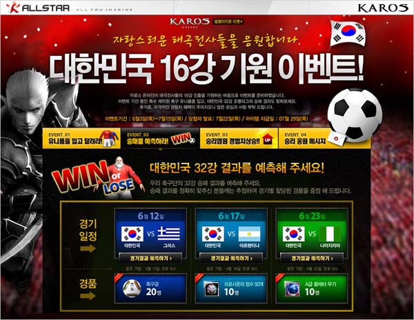 ... 가장 먼저 <카로스 온라인>은 ‘승패결과 예측 이벤트’를 실시, 32강 조별리그인 그리스전과 아르헨티나전, 나이지리아전의 승패 결과를 정확하게 맞춘 유저들에게 추첨을 통해 2010 월드컵 공인구 ‘자블라니’ 축구공과 최고급 게임 아이템을 선물로 준다. 또한 ‘승리염원