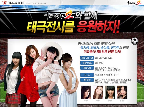 ... 이벤트에 당첨되는 유저들은 대학로에 마련된 이벤트 장소에서 레이싱 모델 송아름, 육지혜, 한가은, 최슬기와 함께 6월 17일의 아르헨티나전을 단체 관람하게 된다. 이벤트 응모 기간은 오늘부터 6월 13일까지로, 이벤트 페이지에 있는 ‘응원 신청하기’ 버튼을 통해 바로 응모할
