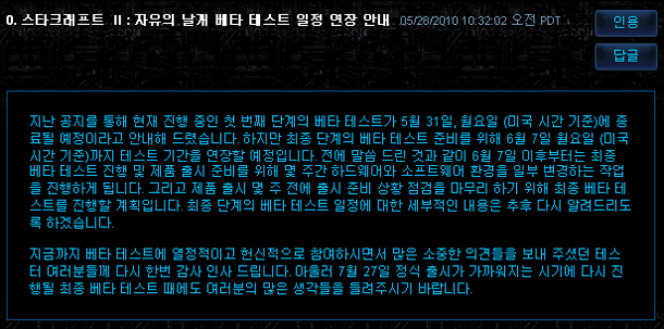...스타크래프트2;자유의날개(이하 스타2)의 베타테스트가 1주일 연장된다. 블리자드는 지난 2월 18일 시작된 블리자드의 신작 RTS게임 '스타크래프트2;자유의날개(이하 스타2)'의 베타테스트가 당초 일정보다 1주일 연기된 오는 6월 7일 종료된다고 공지했다. 블리자드는 공지를