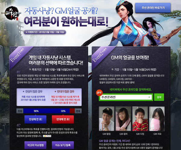 ... 불법 프로그램 사용자들로 인해 부정적 인식이 적지 않은 가운데 '주선'이 자동사냥 도입에 대한 유저들의 의견에 따라 도입 여부를 결정하기로 하고, 게임 홈페이지를 통해 지난 10일부터 찬반투표를 진행하고 있다. 16일 자정까지 찬반투표를 진행, 게임게시판과 아고라 찬반 투표를
