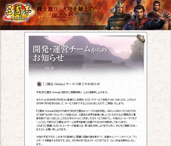 ...일본의 게임개발사 코에이테크모는 자사의 온라인게임 '삼국지온라인'의 오는 7월 19일 일본 서비스 종료를 공식홈페이지 공지를 통해 13일 밝혔다. 삼국지를 소재로 대규모 전투를 구현해 2008년 2월 29일부터 정식 서비스 된 이 게임은 약 3년만에 서비스 종료를 맞이한 것.