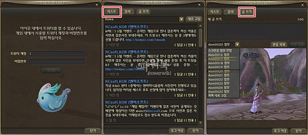 ...0 업데이트를 통해 게임 내에서 트위터 접속이 가능한 기능을 추가한다고 밝혔다. 이 기능은 게임 내에서 트위터 계정을 설정해 게임을 즐기면서 트위터의 글을 확인할 수 있으며 게임 스크린샷을 찍은 후 바로 트위터에 올릴 수 있는 기능도 포함하고 있다. '아이온' 트위터는트위터