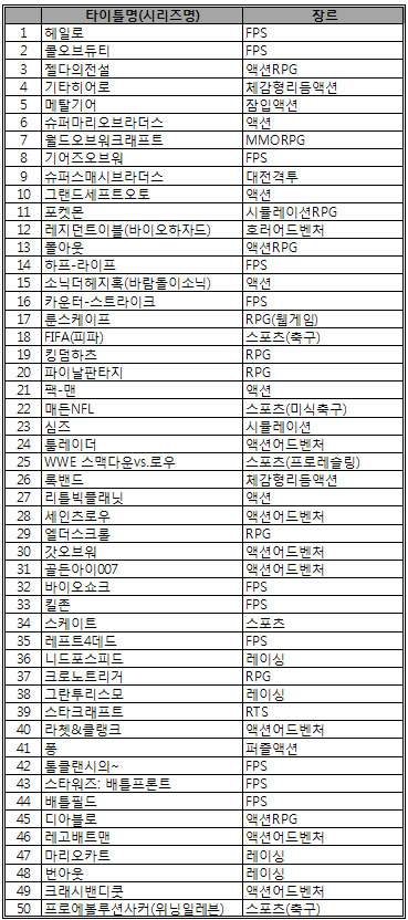 ...세계의 이색 기록을 남긴 기네스북으로 익히 알려진 기네스월드레코드가 최고의 게임시리즈 50위를 발표했다. 이번 순위는 해외 게이머 대상 온라인 투표를 통해 선정된 것으로 1위의 영예는 국내에서도 발매돼 큰 인기를 얻은 바 있는 Xbox용 FPS게임 '헤일로' 시리즈에게 돌아갔으