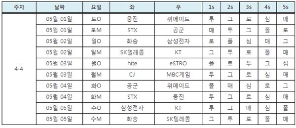 ... 이번 대결은 KT에게는 연승을 달리기 위한 발판 마련, SK텔레콤에게는 지난 3라운드에서 이영호 한 명을 막지 못하고 역올킬을 당한 분풀이의 장이 될 전망이어서 큰 관심이 모이고 있다. KT는 4라운드 초반 2연패를 당하면서 블라인드 엔트리에 적응하지 못했다는 지적을 받기도 했
