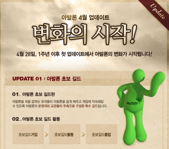 ... 특히, 이번 업데이트의 핵심인 ‘초보 길드’ 시스템은 이용자들이 운영자와 교관으로 구성된 길드에 가입해, 게임을 배우며 레벨을 상승시키고, 가입과 길드 졸업 및 특정 레벨 달성 시마다, 단계별로 유용한 아이템을 획득해, 수월하게 게임을 진행할 수 있도록 하며, 적응을 돕게 된다