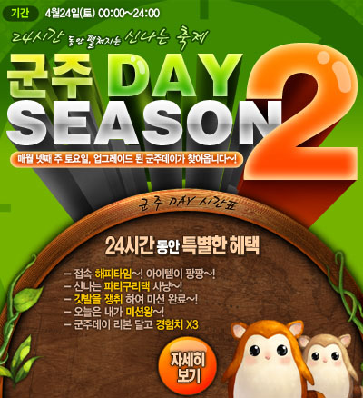 ... 또한 매시 0분과 30분에 약 10분 동안 랜덤으로 나타나는 5마리의 파티구리댁을 타격하면 구리댁 양말, 강황탕 등과 파티케익 제조가 가능한 생크림, 빵, 우유 등이 지급되며 파티케익 사용 시 약 20분 동안 공격력과 방어력이 20%상승하는 효과를 가질 수 있다. 이밖에 리뉴얼