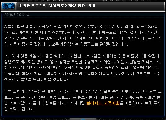 ...블리자드는 20일 공식 포럼을 통해 핵프로그램과 시스템을 악용한 '디아블로2' '워크래프트3' 계정 32만 개에 대해제재했다고 발표했다. 발표된 내용에 따르면 처음 적발된 경우에는 30일 간의 계정 정지를, 그리고 위반이 반복된 경우에는 영구 계정 정지 조치가 취해졌다. 블