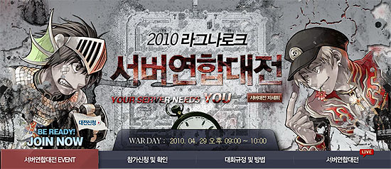 ... 이번 대전에 참가를 원하는 유저는 90레벨 이상의 캐릭터에 한해 22일부터 라그나로크 홈페이지를 통해 접수하면 되며, ‘타나토스’, ‘사라’, ‘란드그리스’, ‘바포메트’ 등 각 서버 별로 152명씩 선착순 모집한다. 서버연합대전에서 우승한 서버에게는 한 주 동안 경험치 2