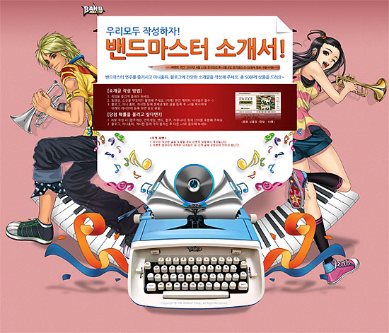 ...com)는 게임 리뷰 이벤트를 실시한다. 금일 22일부터 5월6일까지 2주간 진행되는 이번 이벤트는 밴드마스터를 즐기고 난 후 직접 게임을 소개하는 리뷰를 글이나 동영상, 스크린샷 등을 활용해 자유로운 형식으로 작성하면 된다. 게이머는 작성된 밴드마스터 리뷰를 자신의 블로그나