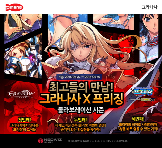 ...이번 업데이트는 만화 속 배경이 게임 내 소셜레이드 던전, 이벤트 던전 등에 그대로 구현되며 사테라이자, 가넷사, 엘리자베스, 리나 등 총 7종의 '프리징' 캐릭터 카드가 추가된다. 이용자들은 던전 탐험 혹은 게임 아이템을 사용할 경우 무작위로 캐릭터 카드를 획득할 수 있다. 업