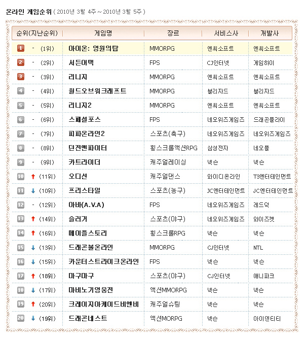 ... 이번 주 온라인게임 순위를 살펴보면 상위권 순위변동은 없는 가운데 야구게임들의 순위 상승이 눈에 띄는 한 주 입니다. 우선프로야구 시즌 개막과 더불어 상승세를 보이고 있는 '슬러거'와 '마구마구'의 경쟁이 다시금 시작된 분위긴데요. '슬러거'는 지난주 14위에서 13위로